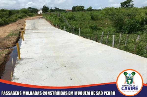 Anteriormente, ainda na atual administração de Elmo Aguiar, a Prefeitura Municipal de Cariré já havia construído duas passagens molhadas na estrada vicinal que liga Muquém de São Pedro à sede municipal. Essa estrada também foi reconstruída para a melhoria do tráfego durante a época invernosa.